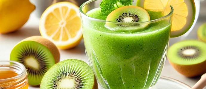 Очистите киви от кожуры и положите в чашу блендера. Добавьте к нему нарезанный лимон и петрушку. Тщательно измельчите все ингредиенты. Затем добавьте мед, мяту и воду, и снова перемешайте смесь в блендере до однородной консистенции. Ваш полезный напиток готов, употреблять сразу после приготовления!